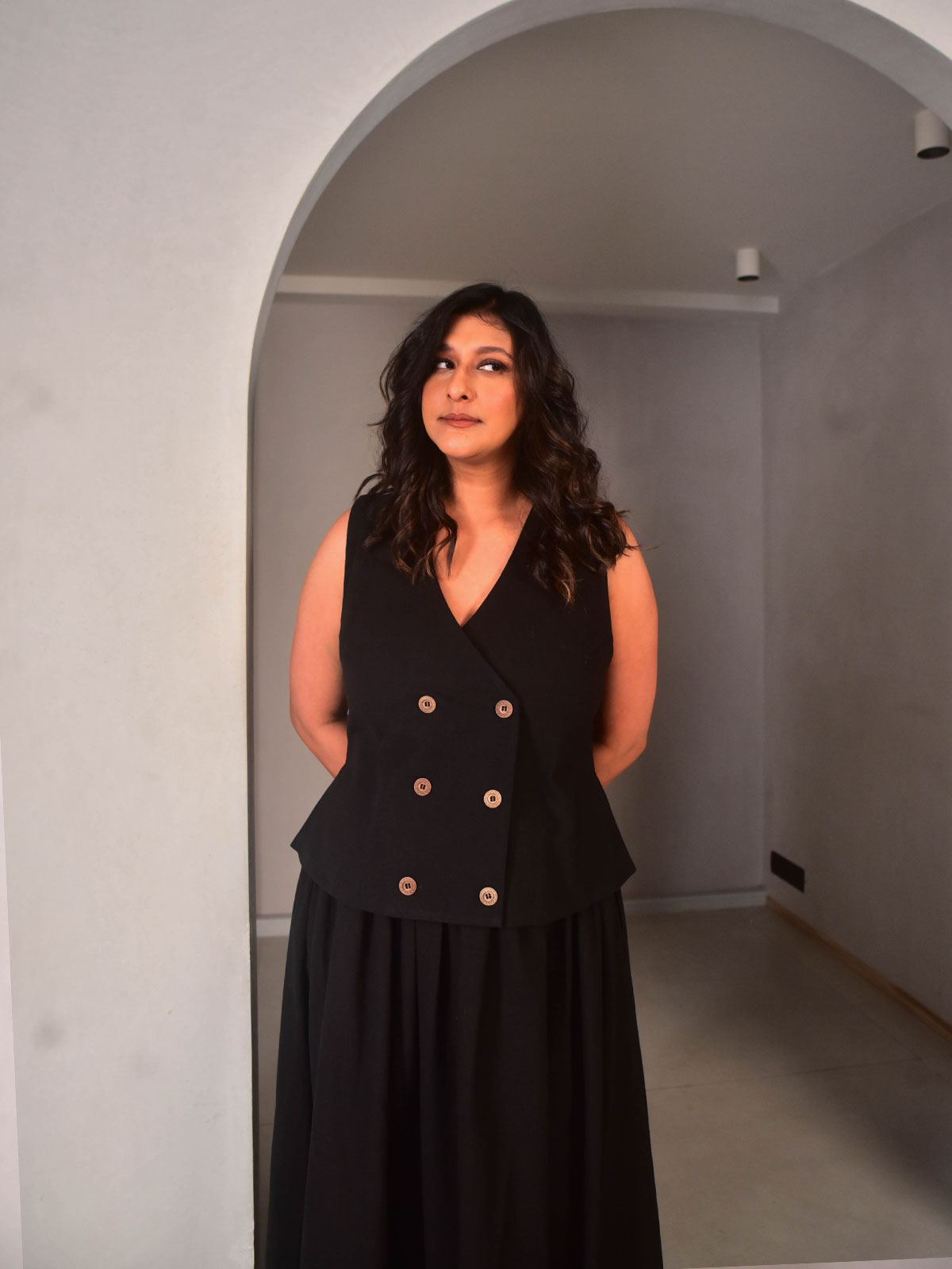 Our dainty Amal Vest Skirt in ink black for languid evenings. Cut in Black crinkled cotton, the stylish double-breasted vest features front buttons, a back tie-up to accentuate the waist, and two side slits for added elegance. Complete the ensemble with our pleated skirt for a flowing and comfortable look.