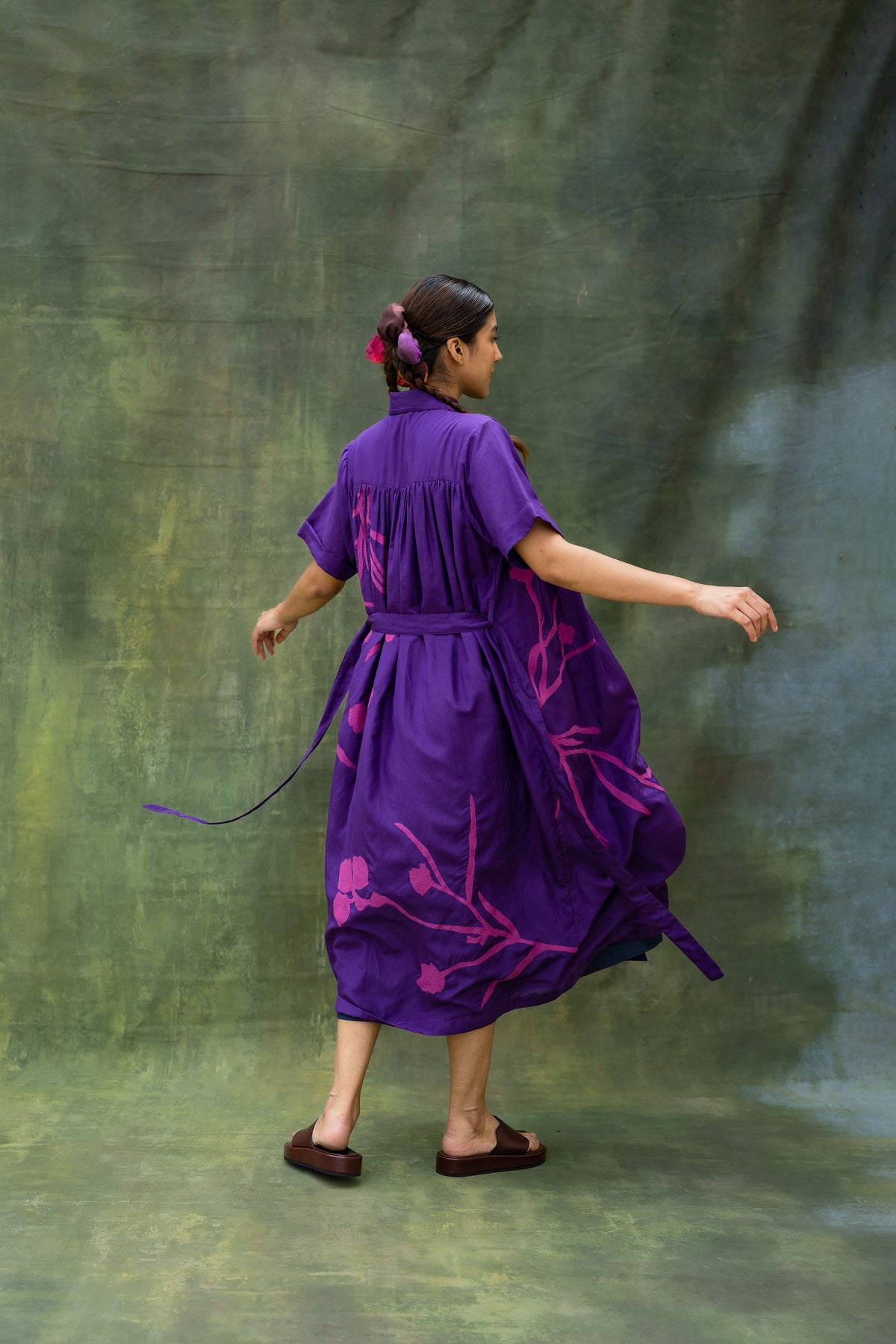Oversized embroidered dress features gathered details at the shoulders and includes a belt tie-up to cinch the waist. The dress is lined to give strength to the material. Connect with us for customisation.